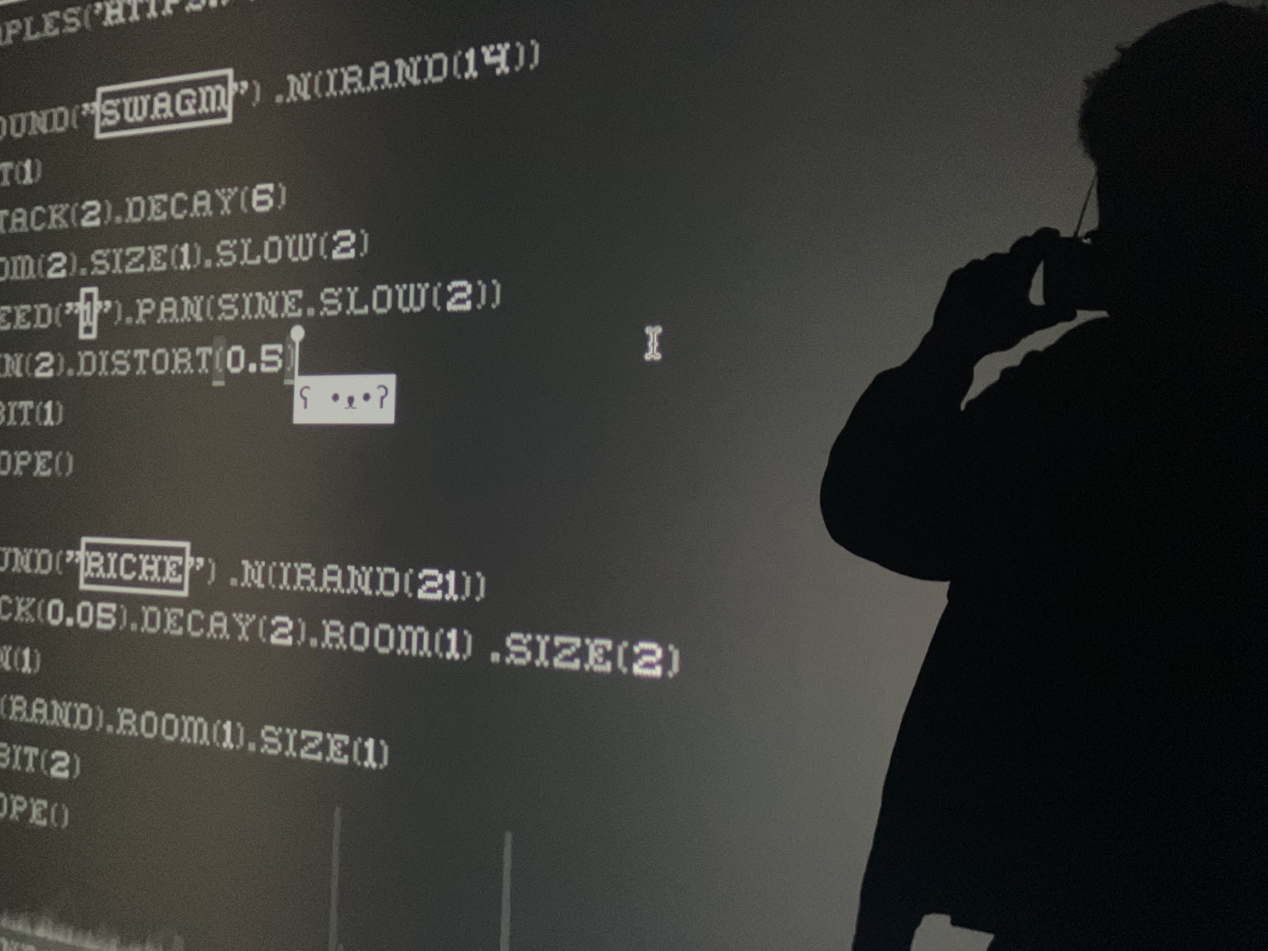 L’idée pour mon atelier était d’offrir aux étudiants l’entrée en matière la plus directe et la plus frontale possible. Il s’agissait de leur apprendre à improviser le plus rapidement possible après quelques minutes seulement de découverte de l’outil utilisé : Tidal Strudel. Chacun était ensuite invité à travailler sur un projet individuel ou collectif, à approfondir l’utilisation de l’outil en autonomie. Strudel est un instrument de musique : le meilleur moyen de le maîtriser est de pratiquer ! L’outil est suffisamment foisonnant pour que l’utilisateur soit amené à découvrir de nouvelles choses même par simple manipulation accidentelle. Les journées suivantes s’organisaient autour de trois activités : des moments de pratique (1), de jeu collectif (2) et des moments de pause (3). Chaque pause était dédiée au fait de répondre aux questions de chacun. Nous avons abordé tour à tour des questions de synthèse, d’acoustique, de programmation, abordé certaines subtilités techniques liées au navigateur internet ou aux fonctionalités les plus avancées de l’outil (audioréactivité, import de ressources, etc). Chaque point spécifique n’était abordé que pour faire face à un obstacle créatif ou une contrainte particulière : la recherche d’un geste musical, d’un timbre particulier, l’écriture d’un motif musical précis, d’une structure, etc. Certains étudiants sont devenus spécialistes d’un domaine particulier (par ex. le sampling), d’autres ont exploré des routes sensiblement différentes. Cela m’a paru plutôt sain de voir une diversité de profils musicaux émerger face à un outil capable de s’adapter à des pratiques extrêmement variées tant par leur méthodes que par leurs objectifs.