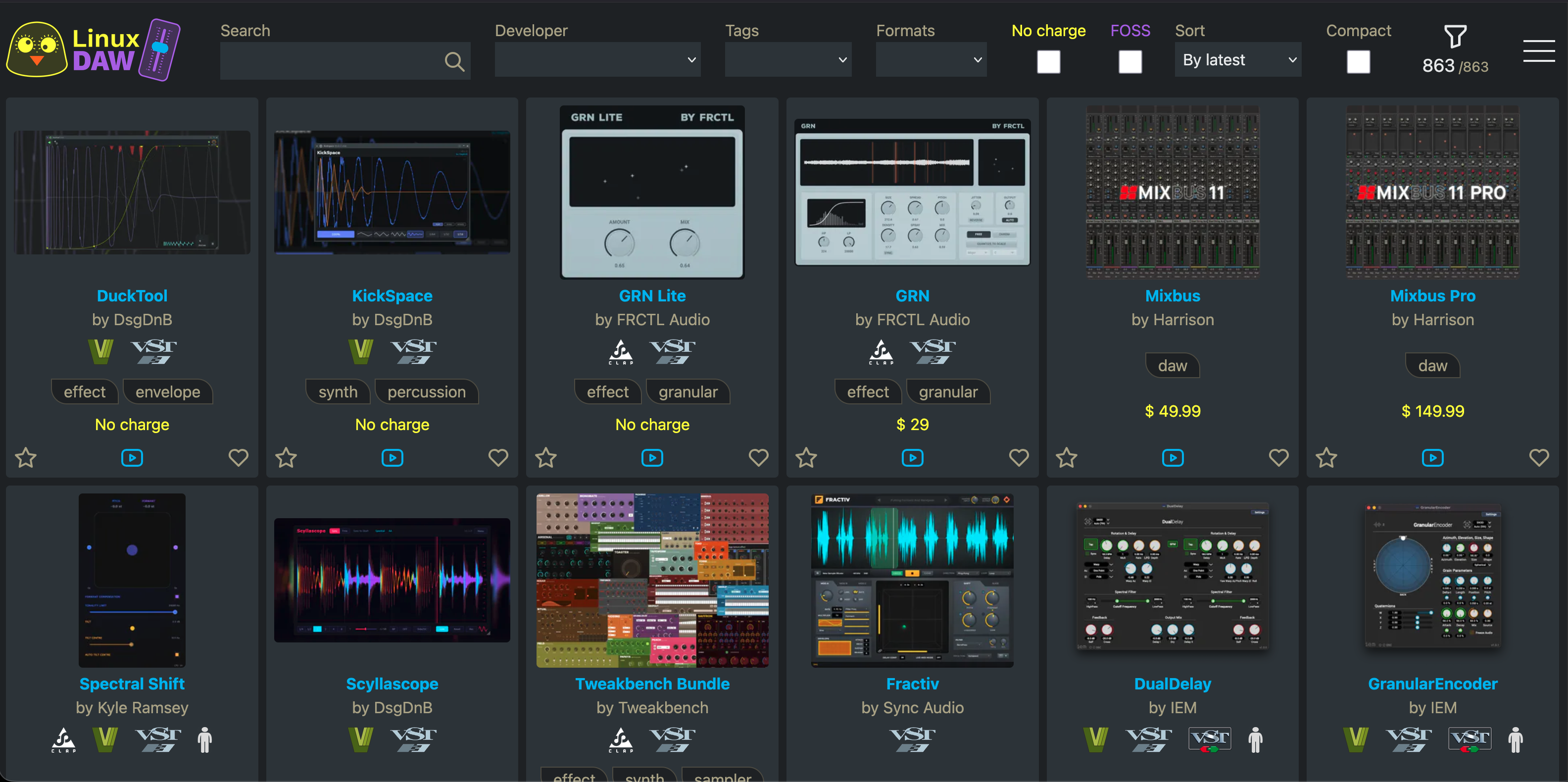 linuxdaw.org est un catalogue visuel de plugins audio pour Linux — LV2, VST2, VST3, CLAP et standalone. Le site recense aussi bien des outils libres (Chowdhury, CHAIR) que des outils propriétaires portés sur la plateforme (u-he, Audio Damage, Sinevibes, TAL Software, Harrison, AudioThing, discoDSP). Un bon rappel de l’étendue de l’écosystème audio Linux aujourd’hui.
